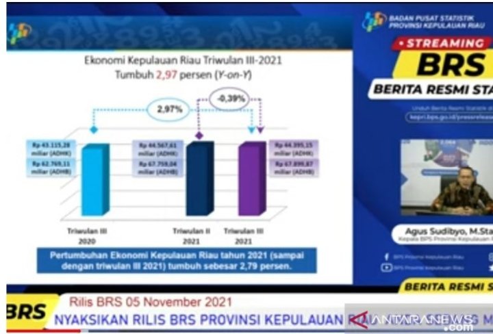 Tanjungpinang, KRsumsel.com – BPS mencatat perekonomian Provinsi Kepulauan Riau (Kepri) triwulan III 2021 tumbuh sebesar 2,97 persen dibanding triwulan III 2020 yang terkontraksi sebesar 5,81 persen, namun jika dibanding triwulan II-2021 turun sebesar 0,39 persen.