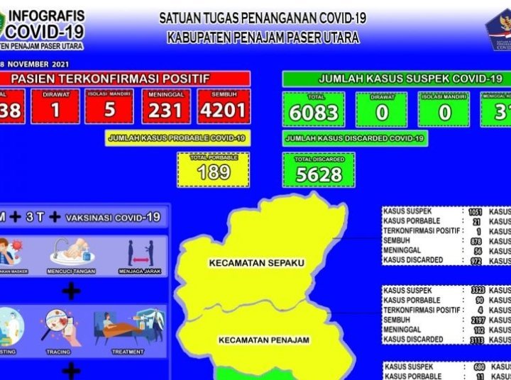 Perkembangan per kecamatan dari total positif sebanyak 4.438 orang tersebut adalah di Kecamatan Penajam masih zona kuning yang tersisa 4 orang positif, 2197 orang sembuh, dan 102 orang meninggal.