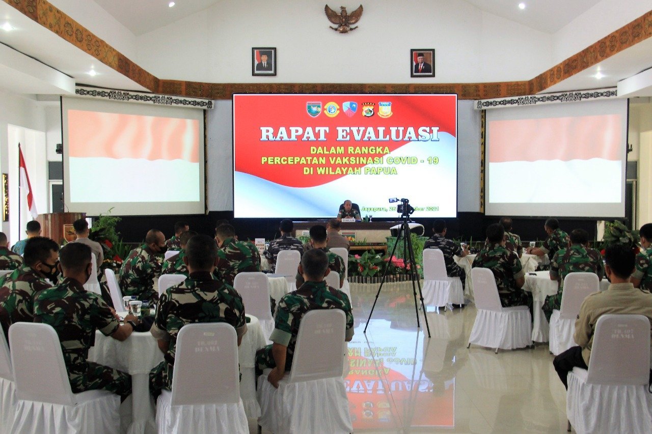 Jayapura, KRsumsel.com – Dalam rangka meningkatkan cakupan vaksinasi Covid-19 di Provinsi Papua, Kodam XVII Cenderawasih mengadakan Rapat Evaluasi Percepatan Vaksinasi Covid-19 yang dipimpin langsung oleh Pangdam XVII/Cenderawasih Mayjen TNI Ignatius Yogo Triyono, M.A., bertempat di Aula Tony A. Rompis Makodam XVII/Cenderawasih, Jumat (26/11/2021).