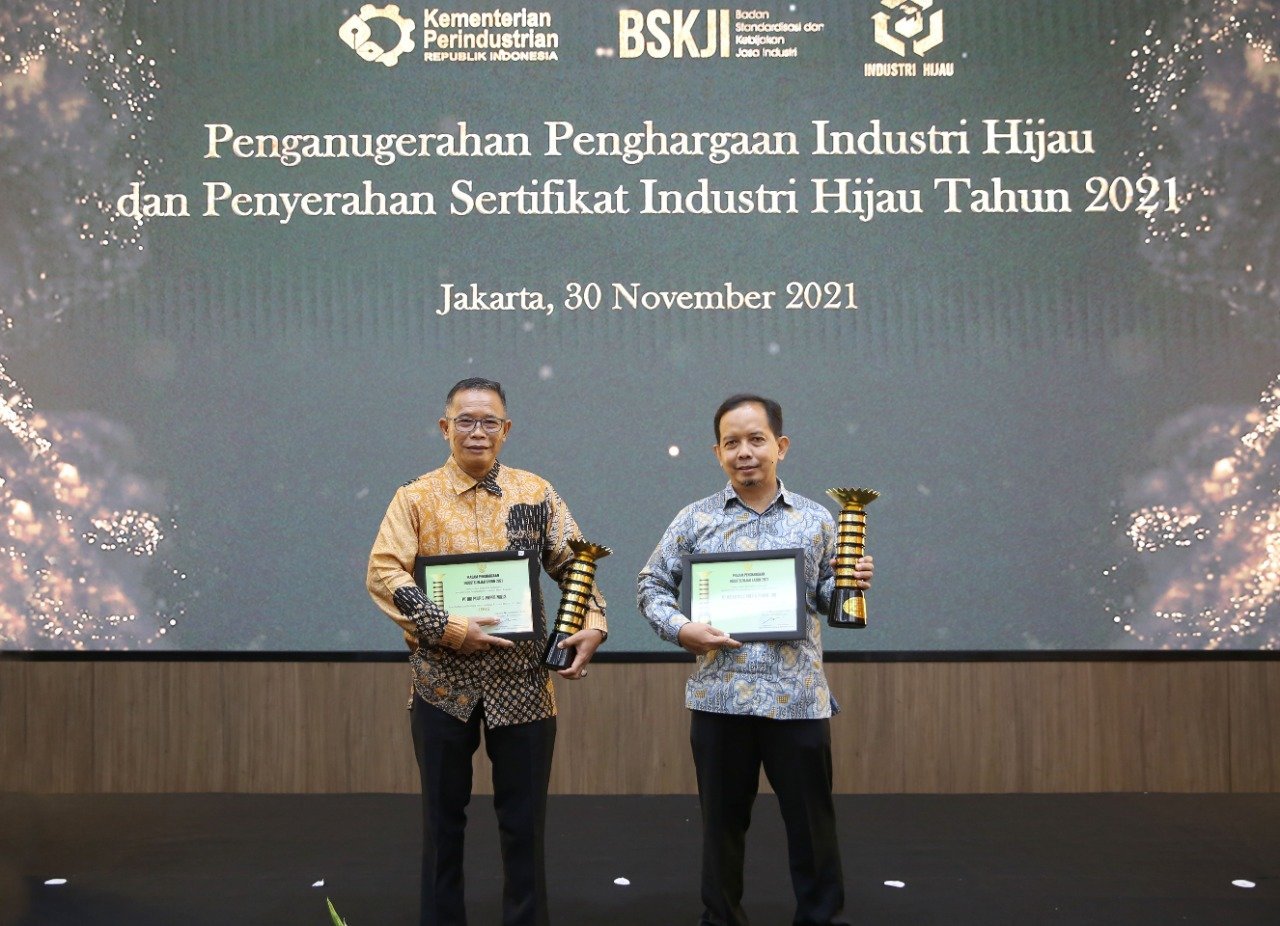 Secara simbolis Wakil Direktur OKI Pulp & Paper Gadang Hartawan, dan Head of Sustainability PT IKPP Tangerang Kholisul Fatikhin menerima penghargaan Industri Hijau ini dari Menteri Perindustrian (Menperin) Agus Gumiwang Kartasasmita di Gedung Kemenperin.