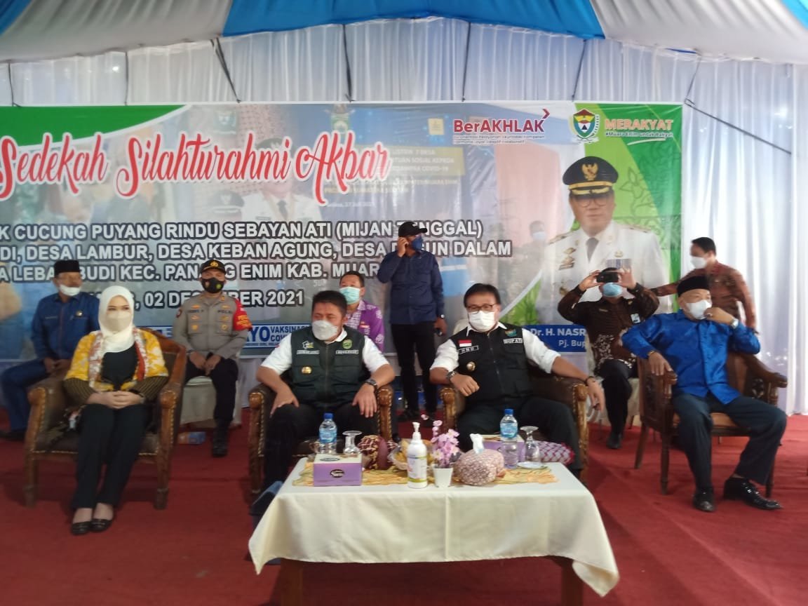 MUARA ENIM, KRSumsel.com – Gubernur Sumatera Selatan (Sumsel) H Herman Deru dan Pj Bupati Muara Enim DR H Nasrun Umar (HNU) menghadiri secara langsung kegiatan Silaturahmi Akbar (Sedekah Dusun) yang dihelat Desa Lebak Budi, Kecamatan Panang Enim, Kabupaten Muara Enim, pada Kamis (2/12/2021).