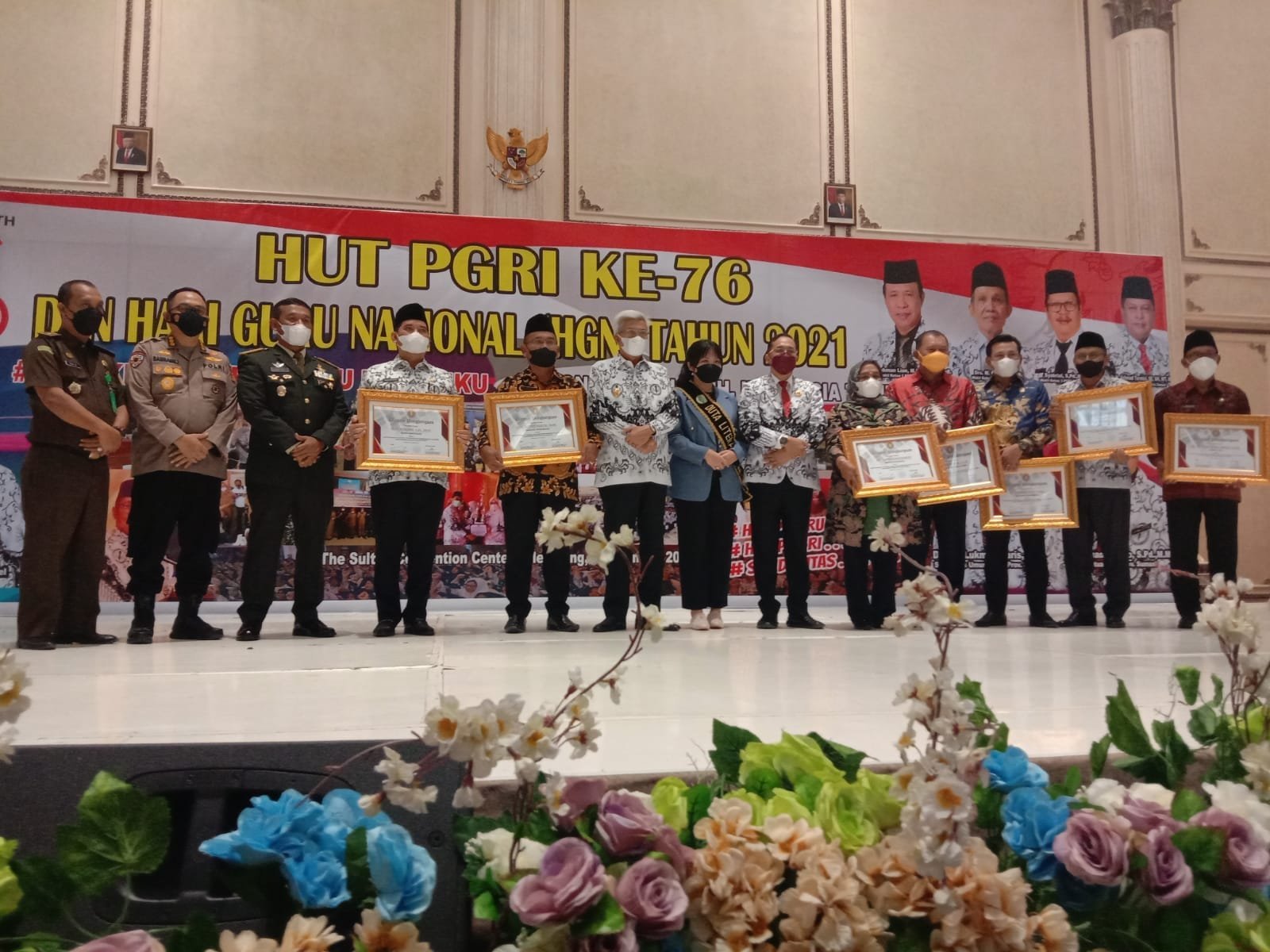 MUBA, KRSUMSEL.com – Puncak peringatan Persatuan Guru Republik Indonesia (PGRI) ke-76 tahun dan Hari Guru Nasional tahun 2021 tingkat Provinsi Sumatera Selatan dirangkaikan dengan pemberian penghargaan kepada bupati / walikota yang telah peduli terhadap pendidikan dan insan pendidikan, di The Sultan Convention Center, Jl. Sultan M. Mansyur No.7, Bukit Lama Kecamatan Ilir Barat I Kota Palembang, Kamis (2/12/2021).