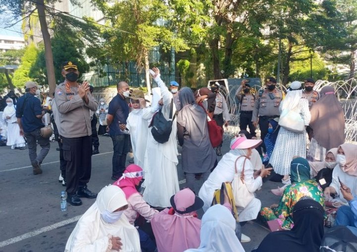 “Bapak ibu semua yang kami hormati, kami mohon bapak ibu sekalian tidak berkumpul di sini. Kembali ke rumah masing-masing, monggo. Sekali lagi bapak-bapak, ibu-ibu, untuk tidak berkumpul. Oke foto-foto dulu,” kata Kombes Pol. Badya di Jalan Kebon Sirih, Jakarta, Kamis.