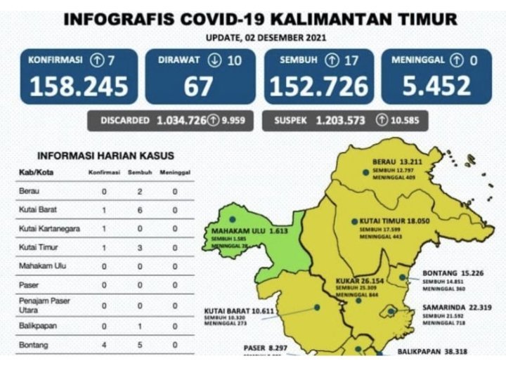Sedangkan sembilan Kabupaten dan Kota lainnya seperti Kutai Kartanegara, Paser, Panajam Paser Utara, Berau, Kutai Timur, Kutai Barat, Bontang, Samarinda dan Balikpapan berstatus zona kuning.