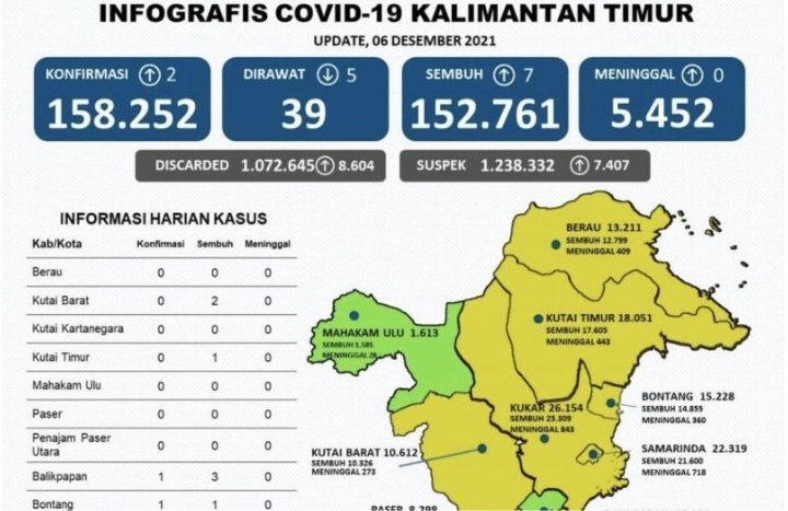 Samarinda, KRsumsel.com – Perkembangan kasus COVID-19 di Provinsi Kalimantan Timur masih menunjukkan angka penurunan kasus, saat ini pasien terkonfirmasi positif yang masih menjalani perawatan hanya tersisa 39 orang berdasarkan update kasus harian, Senin.