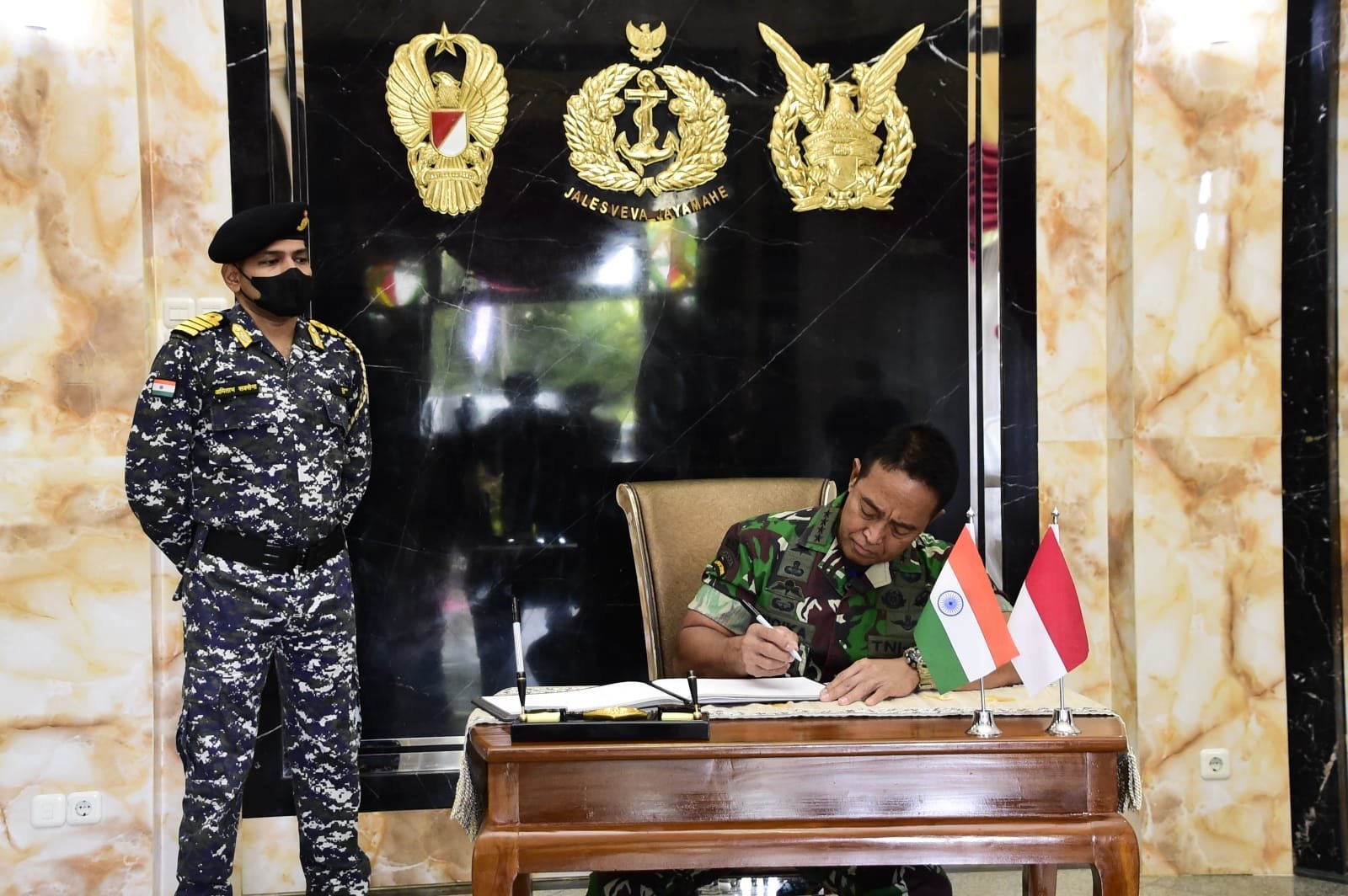 Panglima TNI Jenderal TNI Andika Perkasa didampingi Kepala Pusat Kerjasama Internasional TNI Laksma TNI R. Teguh Isgunanto, M.A. menerima Kunjungan Atase Pertahanan (Athan) India untuk Indonesia Captain (N) Amitabh Saxena di Kantor Panglima TNI Jl. Medan Merdeka Barat Jakarta Pusat pada Senin kemarin (13/12/2021).