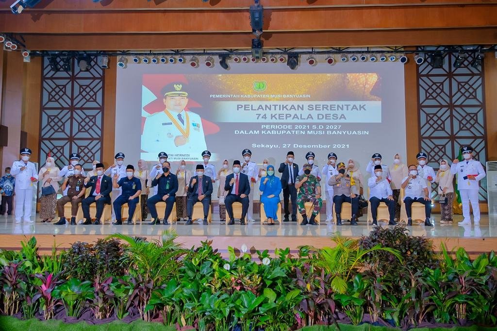 MUBA, KRSUMSEL.com – Plt Bupati Musi Banyuasin (Muba) Beni Hernedi melantik secara resmi 74 Kepala Desa (Kades) yang terpilih di Pilkades serentak Kabupaten Muba tahun 2021. Pelantikan berlangsung di Opprom Pemkab Muba, Senin (27/12/2021).