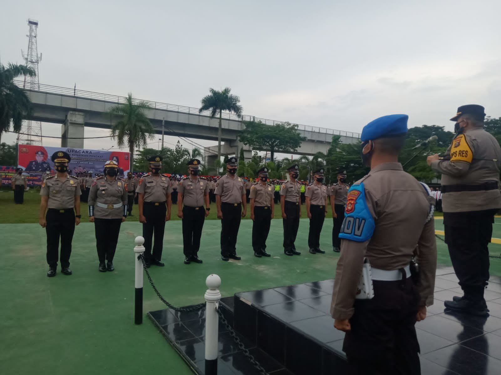 Apel kenaikan pangkat dipimpin langsung oleh Kapolrestabes Palembang, Kombes Pol Irvan Prawira Satya Putra dengan disaksikan jajaran pejabat utama (PJU) yakni Waka Polrestabes dan jajaran Kasat dan Kabag.