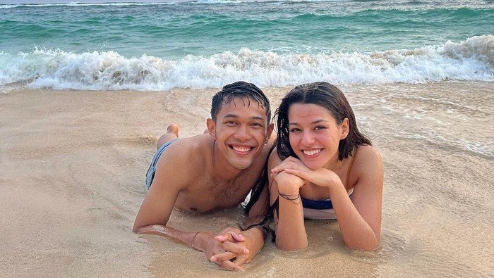 Momen itu terjadi di sebuah pantai di Bali. Tampak Fajar Alfian dan Susan Sameh bersantai di atas pasir pantai yang basah karena gulungan ombak.