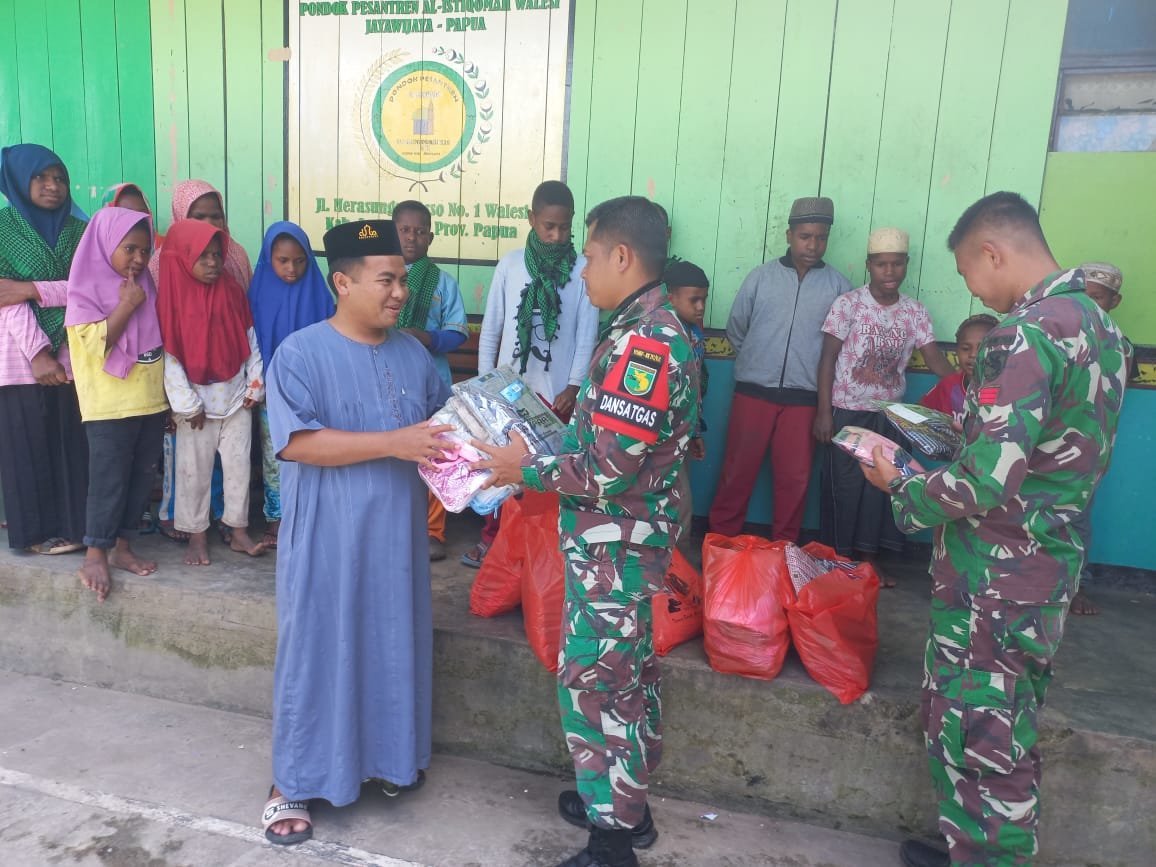Pembagian baju koko dan mukena di Pondok Pesantren Al-Istiqomah, Distrik Walesi, Kabupaten Jayawijaya, Papua, Selasa (25/01/2022) dipimpin langsung oleh Letkol Inf Dedy Dwi Cahyadi, S.I.P selaku Dansatgas Kodim Yalimo Yonif RK 751/VJS.