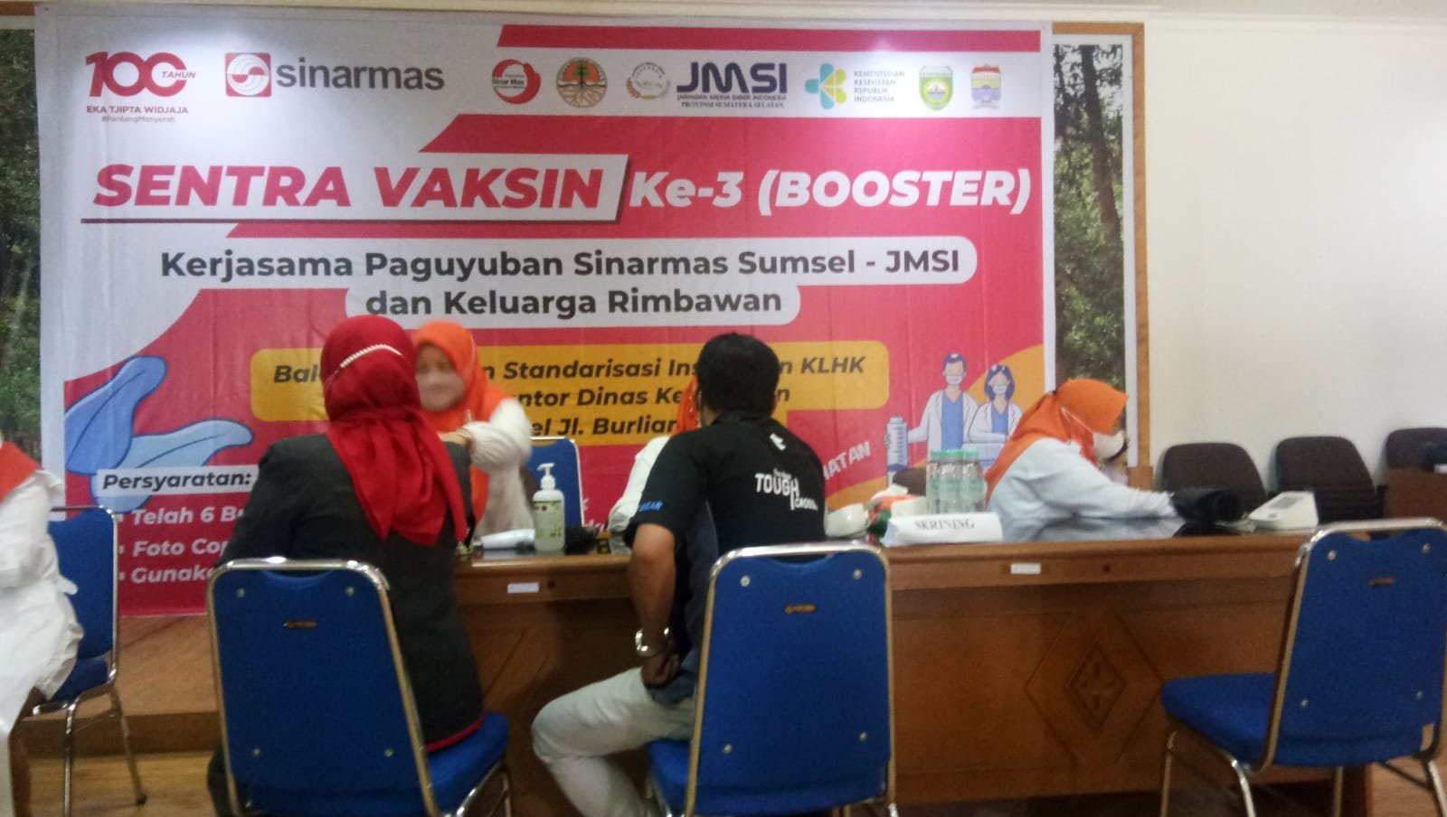 Palembang, KRsumsel.com – Paguyuban Sinarmas Sumsel bersama JMSI (Jaringan Media Siber Indonesia) Sumsel dan Keluarga Rimbawan, Selasa (15/2/2022) menggelar vaksinasi tahap 3 Booster di Balai Penerapan Standarisasi Instrumen Kementrian Lingkungan Hidup dan Kehutanan Palembang.