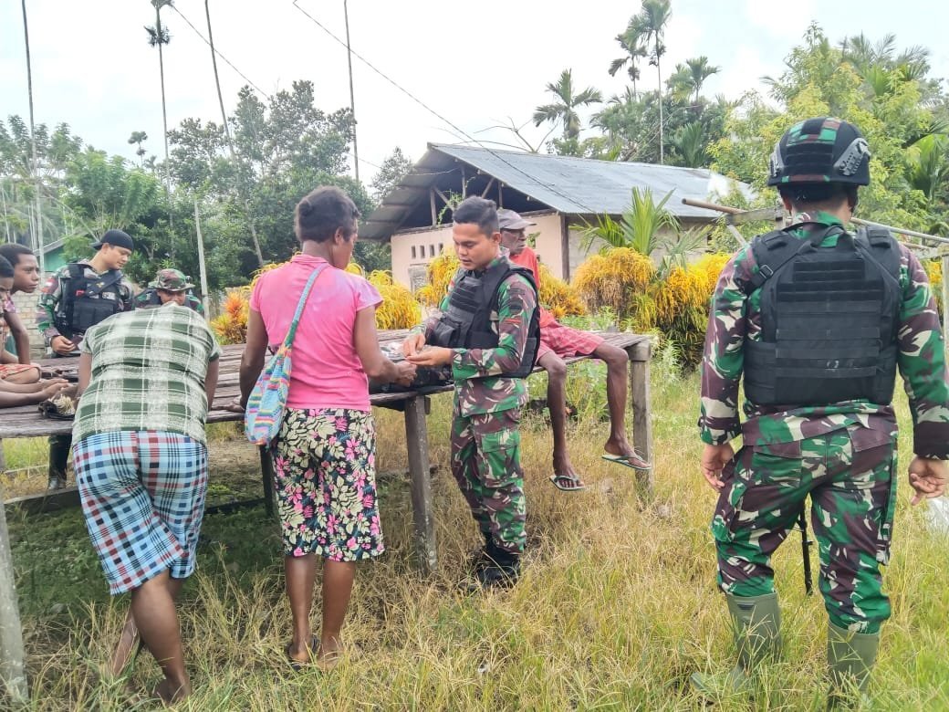 Keerom, KRsumsel.com – Personel Satgas Pamtas RI-PNG Yonif 126/KC memberikan pelayanan pengobatan kesehatan secara gratis untuk warga perbatasan Indonesia-Papua New Guinea (PNG) di Kampung Banda, Dsitrik Waris, Kabupaten Keerom, Papua.