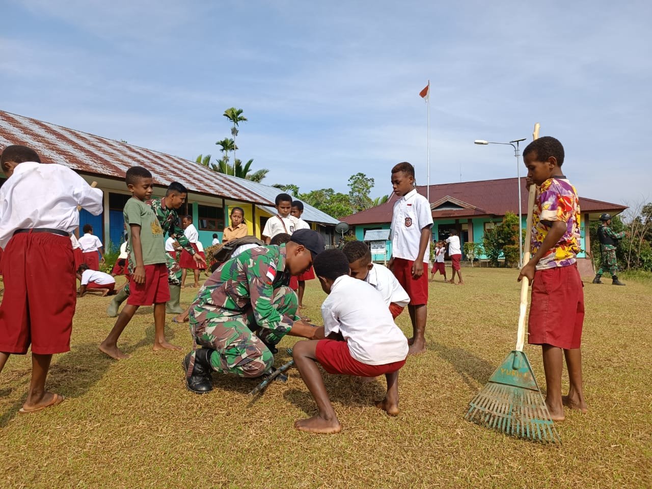 Keerom, KRsumsel.com – Dalam rangka mengajarkan kepedulian terhadap kebersihan lingkungan sejak usia dini, prajurit Satgas Pamtas Yonif 126/KC Pos Yuruf mengajak para murid untuk membersihkan sekolah SD YPPK Yuruf-Amgroto, Distrik Yaffi, Kabupaten Keerom.