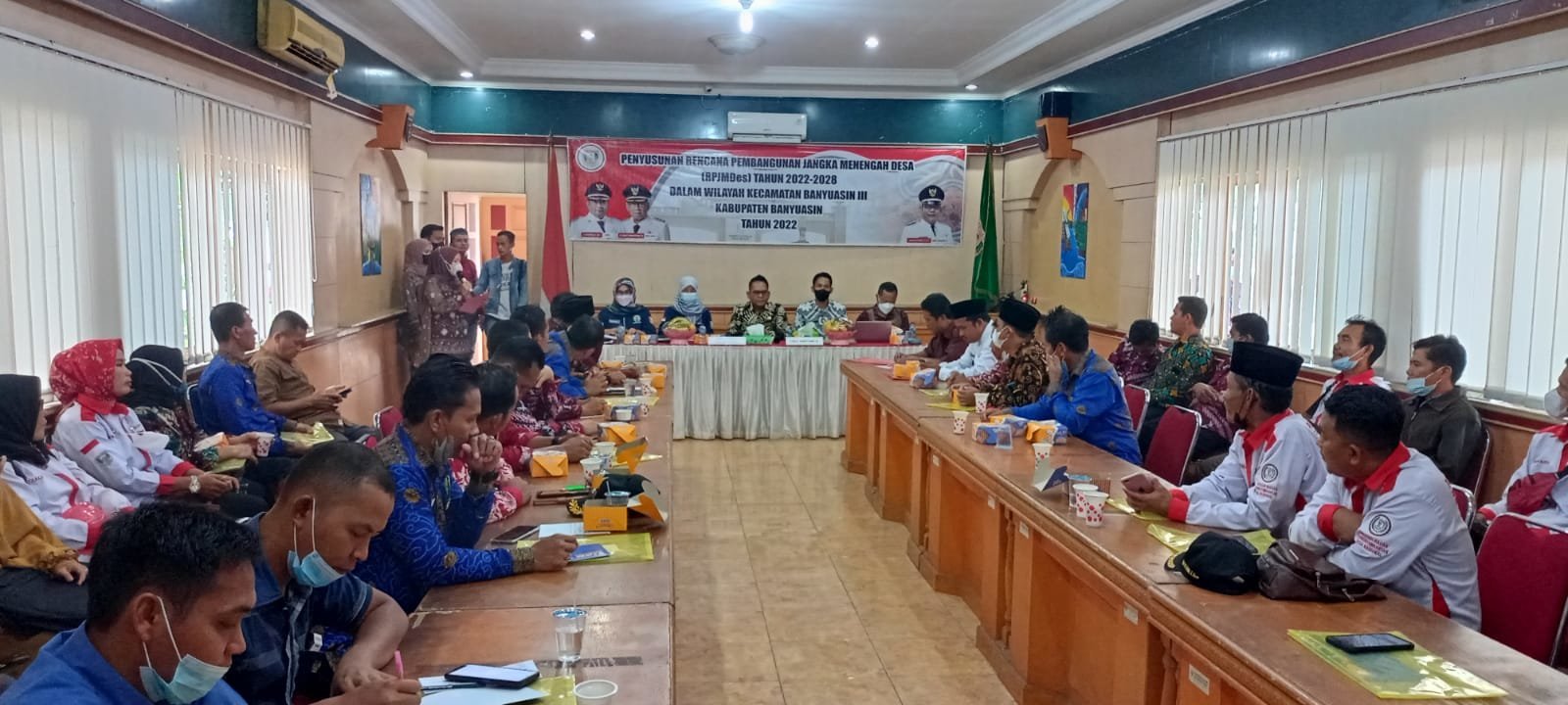 BANYUASIN.KRSumsel.com – Pemerintah Kecamatan Banyuasin III Kabupaten Banyuasin menggelar sosialisasi sekaligus rapat koordinasi Rencana Pembangunan Jangka Menenah Desa (RPJMDesa) Tahun 2022-2028 di Aula Kantor Kecamatan Banyuasin III, Jum’at (18/03/2022).
