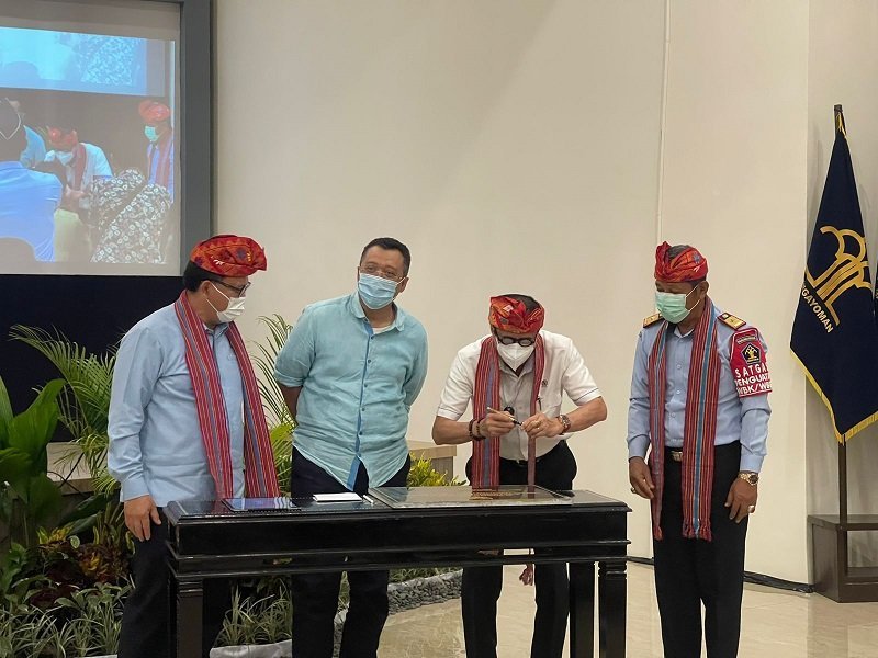 Disambut Gubernur NTB, Zulkieflimansyah, Yasonna Laoly datang langsung ke Provinsi yang baru saja usai menyelenggarakan event MotoGP ini untuk melakukan pengukuhan desa binaan menuju desa sadar hukum, di Kantor Wilayah (Kanwil) Kementerian Hukum dan HAM (Kemenkumham) NTB, Mataram.
