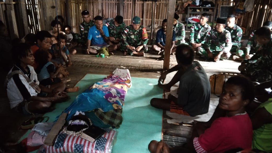 Keerom, KRsumsel.com – Sebagai bentuk kepedulian serta ungkapan rasa bela sungkawa, Prajurit Satgas Pamtas RI-PNG Yonif 126/KC Pos Somografi melayat ke rumah duka Almarhumah Desi Sam (12), meninggal dunia setelah menderita Malaria Trofika di Kampung Somografi, Distrik Web, Kabupaten Keerom.