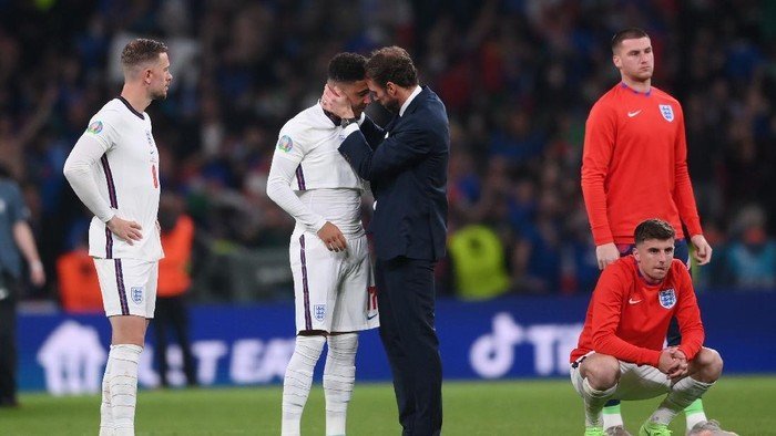 Inggris gagal juara di Piala Eropa 2020 karena kalah lewat adu penalti 2-3 dari Italia di laga final. Kala itu, tiga penendang Inggris yaitu Marcus Rashford, Jadon Sancho dan Bukayo Saka gagal menjalankan tugas.
