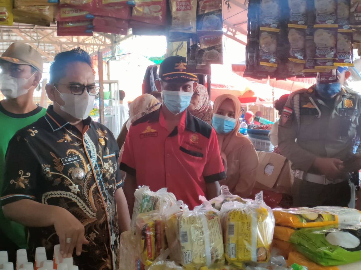 Plt Kepala Dinas Ketahanan Pangan Banyuasin Yuni Khairani bersama Camat Banyuasin III Akhmad Rosyadi, Kabid Perdagangan Pensi Cahayadi dan beberapa jajaran Polres Banyuasin berkeliling pasar melakukan pemantauan terhadap sejumlah harga bahan pokok hingga bumbu dapur.