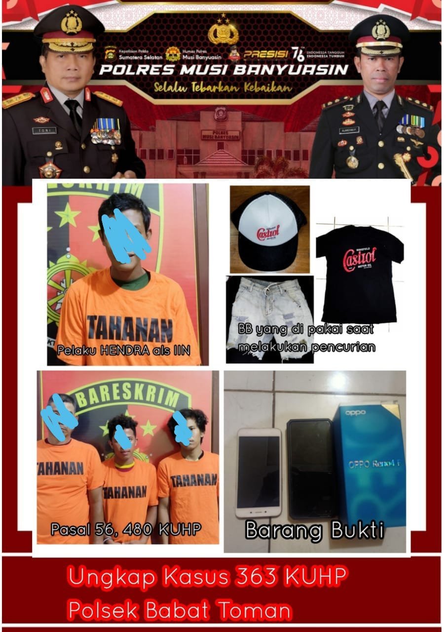Selain pelaku pencurian, Unit Reskrim Polsek Batman juga mengamankan Agustiawan (19) warga Kelurahan Babat Toman, Kecamatan Babat Toman, Kabupaten Muba, MR (18) warga Kecamatan Babat Toman, Kabupaten Muba dan Muhammad Ali Gentian (52) warga Desa Toman, Kecamatan Babat Toman, Kabupaten Muba yang merupakan tersangka penadah barang hasil curian.