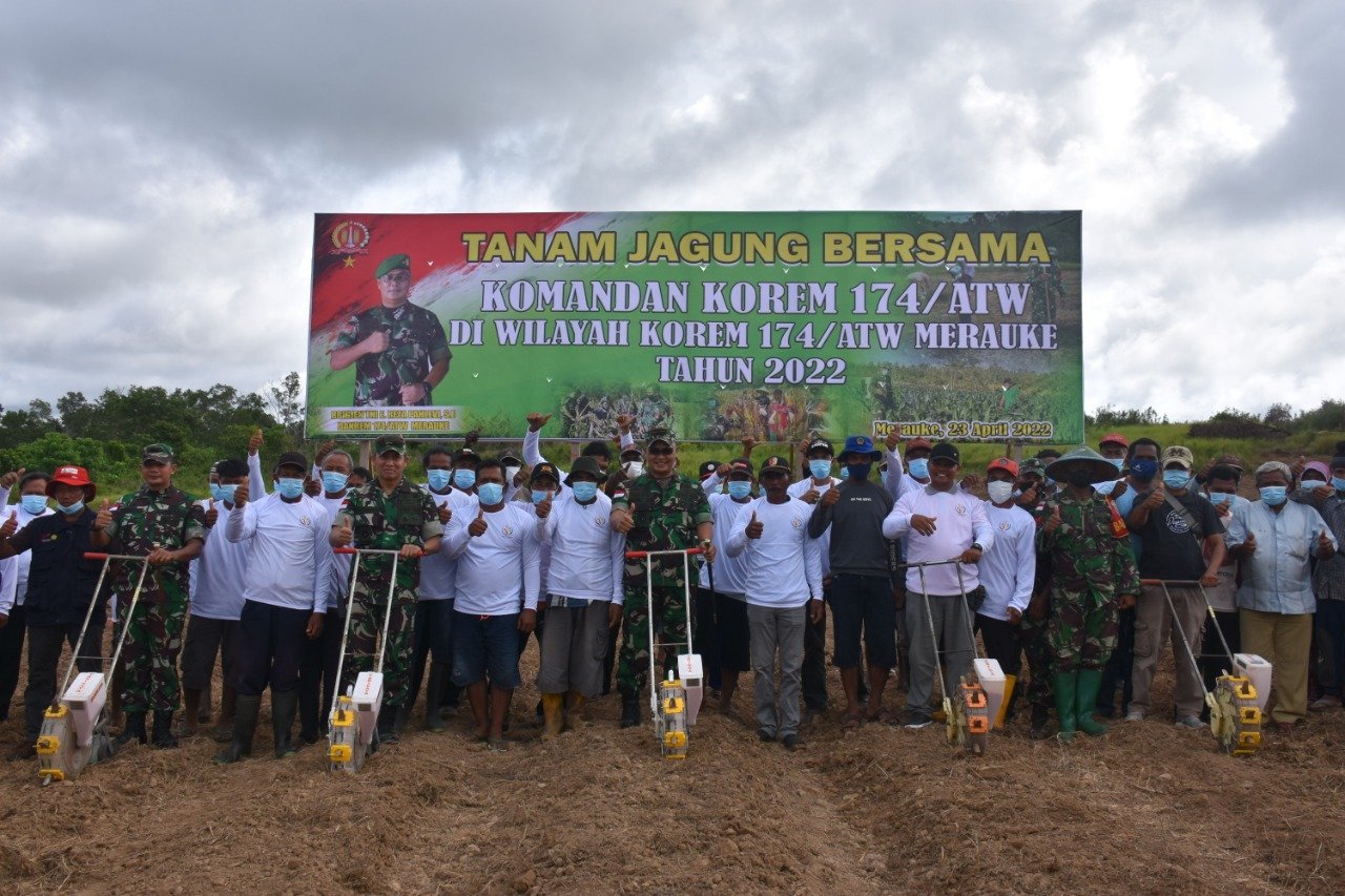 Merauke, KRsumsel.com – Dalam rangka membantu pemerintah meningkatkan ketahanan pangan, Brigjen TNI E. Reza Pahlevi, S.E., selaku Komandan Korem 174/ATW melakukan penanaman jagung bersama Gapoktan (Gabungan Kelompok Tani) binaan Korem 174/Anim Ti Waninggap, bertempat di Kampung Ngutibob (Sarmayam 2) Distrik Tanah Miring, Kab. Merauke, Papua, Sabtu (23/04/2022).