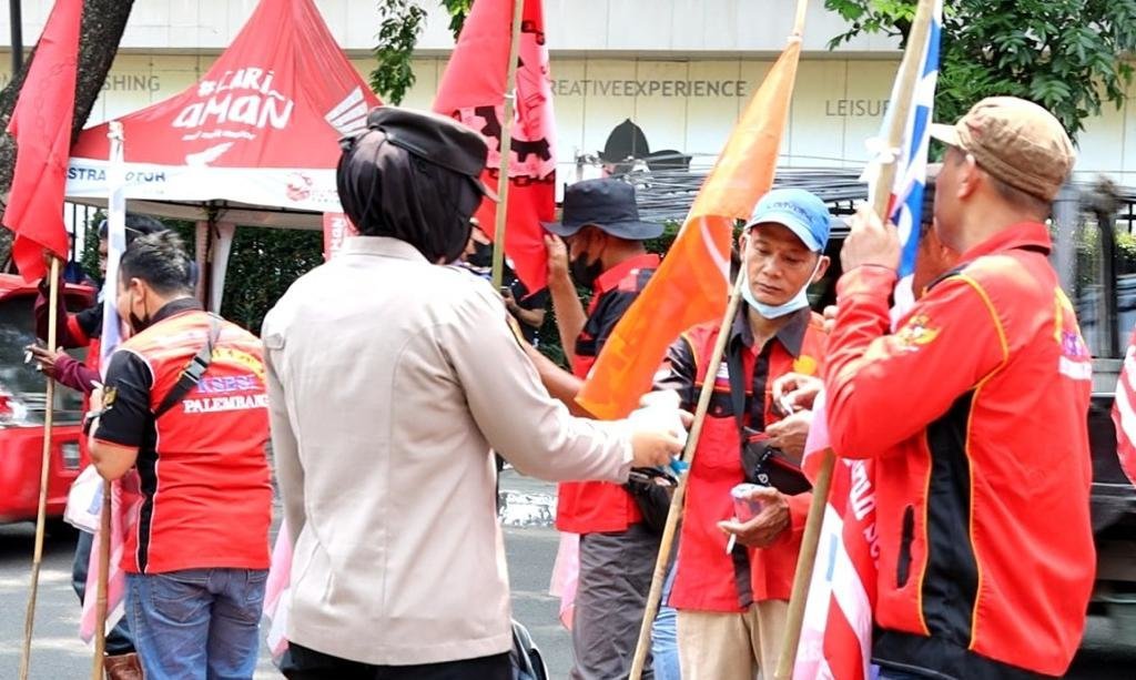 Bahkan dari pantauan media, beberapa personil PJU, perwira hingga ibu Waka Polrestabes Palembang AKBP Andes Purwanti membagikan air minum mineral dan permen kepada para pendemo.