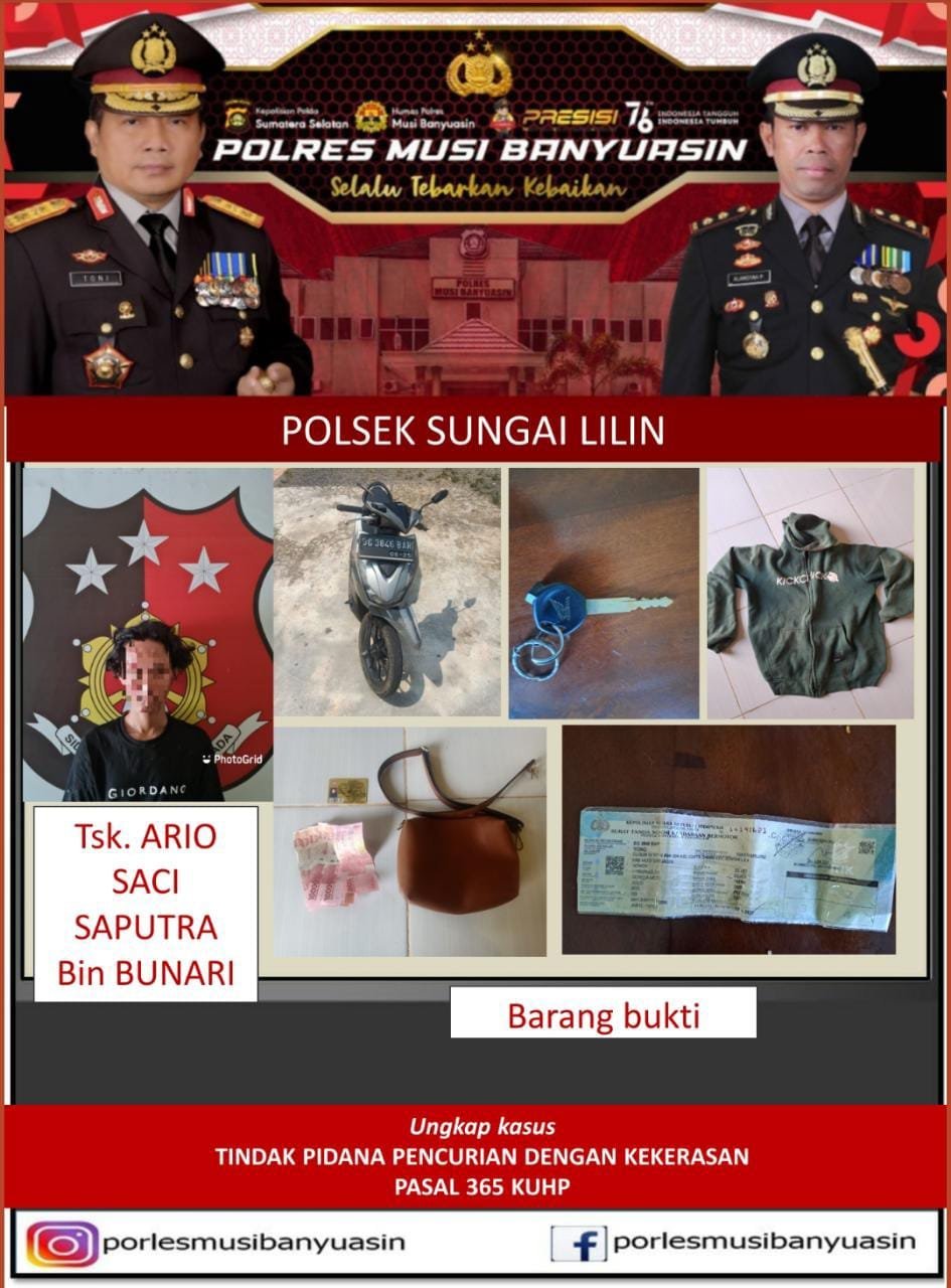 Pekerja serabutan ini menjambret seorang Guru asal Desa Mulyo Rejo Kec.Sungai Lilin Kab.Muba. Akibat kejadian itu, korban Wida Sevni Yenti mengalami kerugian Uang tunai sebesar Rp. 700.000.