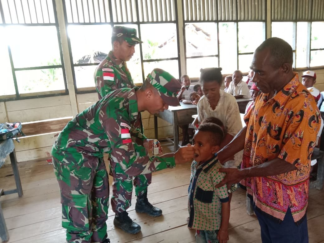 Keerom, KRsumsel.com – Dalam rangkaian mendukung Program Anak Indonesia Sehat, Pos Somografi Satgas Pamtas Yonif 126/KC melaksanakan pemberian syrup obat cacing dan pengecekan rutin kesehatan anak-anak usia sekolah YPPK Akarinda yang berada di Kampung Somografi, Distrik Web, Kabupaten Keerom, Papua.