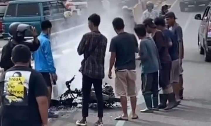 “Api dari bawah mesin, langsung menyambar body plastik motor bagian depan, sehingga api cepat membesar dan mengeluarkan asap hitam. Kalau orang yang membawa motor, dia tidak melihatnya namun informasinya selamat,” katanya saat diwawancarai di lokasi kejadian. Minggu (21/8).