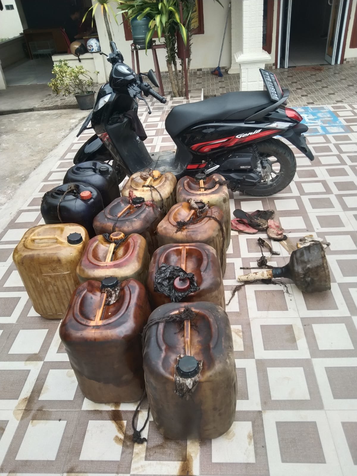 Adapun barang bukti yang berhasil diamankan dalam peristiwa tersebut adalah satu unit sepeda motor Honda Genio warna hitam Lis merah nopol BG 5977 BAW, delapan buah jerigen yang berisi minyak mentah sebanyak 280 liter, dua buah jerigen kosong warna biru, satu buah jerigen kosong warna putih, satu buah klam yang terbuat dari besi yang sudah dimodifikasi, satu batang besi bulat panjang sekira 30 cm, satu corong minyak terbuat dari potongan galon dan pipa paralon, selang ukuran 3/4 warna kuning panjang 40 cm, sepasang sarung tangan, sepasang sandal jepit dan sebilah pisau.