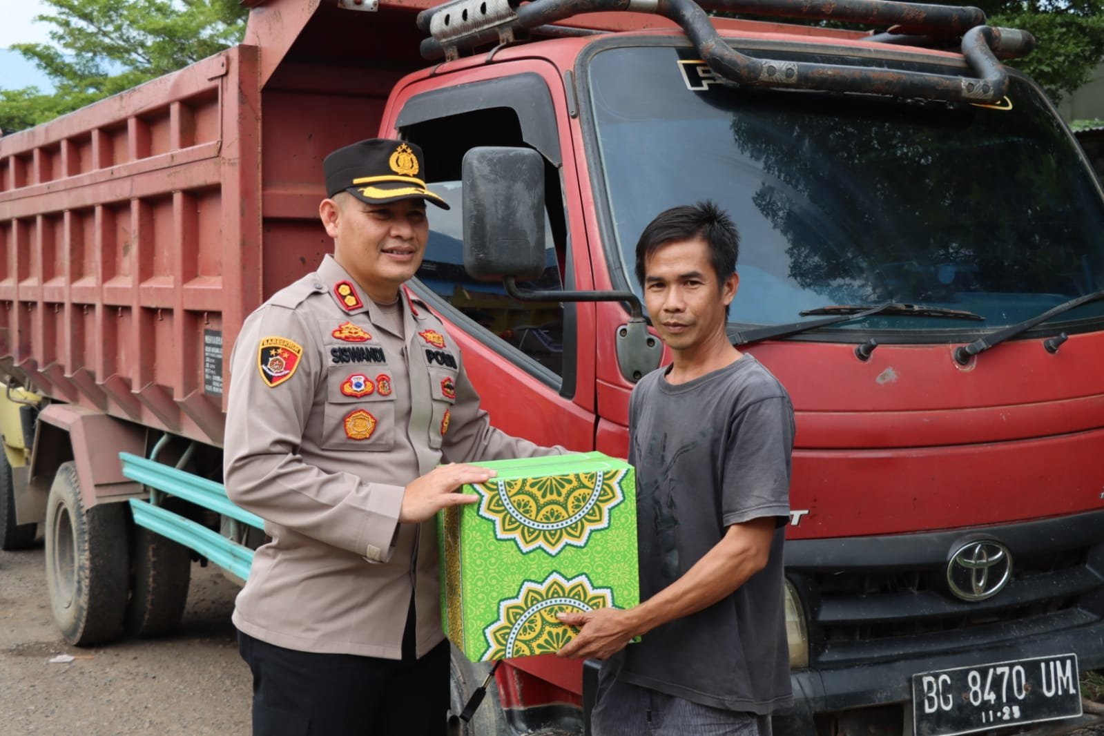 Pembagian paket sembako ke masyarakat dan sopir truk ini, dipimpin oleh Kapolres Musi Banyuasin Akbp Siswandi.