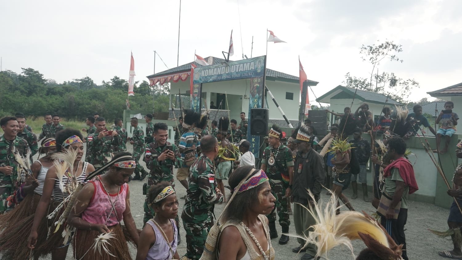 Tarian adat yang diarak oleh sejumlah masyarakat dari kediaman Bapak Yossef, Kepala Suku Klen disambut oleh Wadan Satgas Mayor Inf Wahidin Sobar, S.sos. dengan personel lainnya. Masyarakat dari berbagai elemen dan instansi turut hadir seperti petugas Distrik Waris, Puskesmas, Koramil, Polsek berbondong-bondong datang ke Pos untuk mengantar personel Satgas yang tidak lama lagi akan meninggalkan Pos untuk digantikan oleh Satgas lain dari Yonif 132/Bima Sakti yang sama-sama berasal dari wilayah Sumatera.