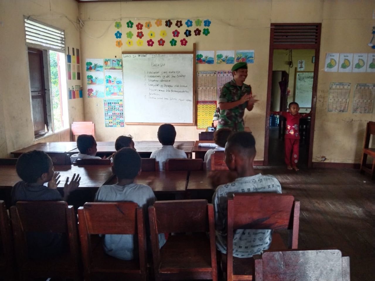 Untuk itu, sebagai bentuk nyata kepedulian TNI dalam melaksanakan pengabdian terhadap NKRI serta sebagai wahana dalam menambah pengetahuan pribadi, Babinsa Koramil 1710-01/Kokonao Serka Sinaga membantu proses belajar mengajar kepada siswa-siswi SD Inpres Kokonao Distrik Mimika Barat. Kab. Mimika, Sabtu (22/10/2022).