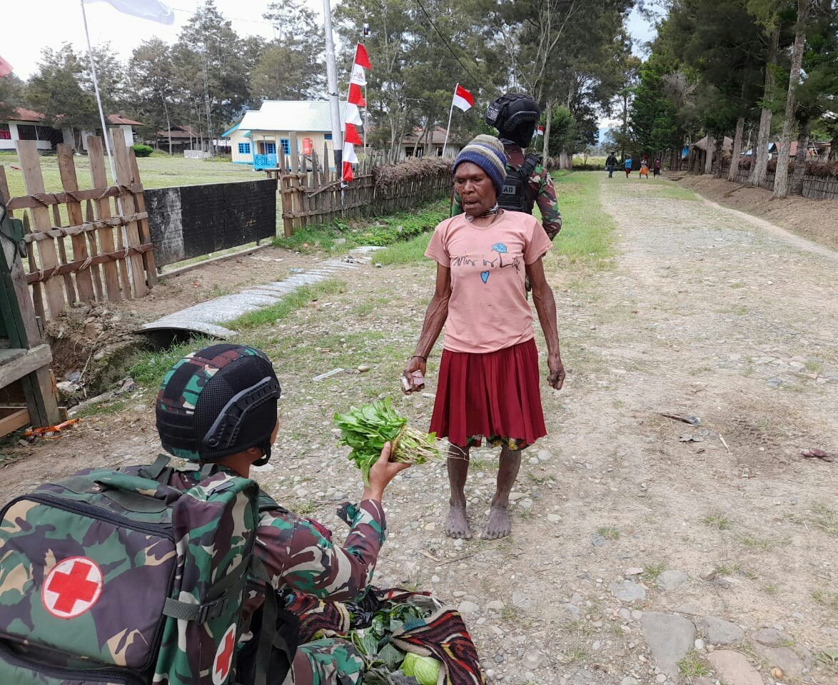 Melihat mama Papua yang membawa barang jualan yang tidak terjual dan berjalan dengan langkah yang terlihat lelah, membuat Personel Satgas Yonif Raider 142/KJ langsung membeli hasil kebun mama tersebut.
