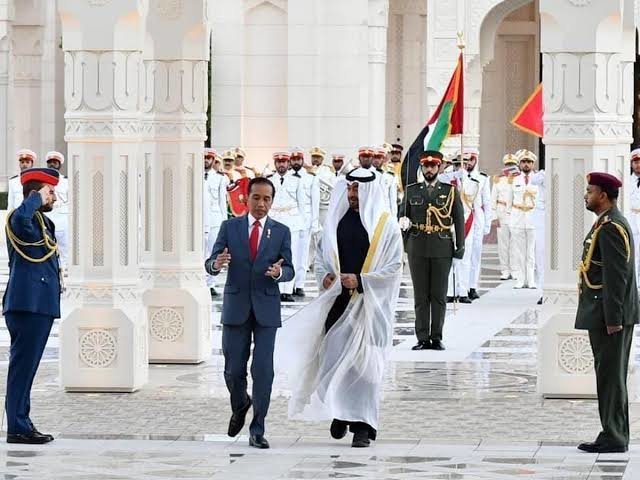 Mohammed terlihat berbincang dengan Gibran untuk beberapa saat. Presiden UAE itu juga disambut pasukan kehormatan Paspampres dan para petugas yang mengenakan pakaian adat khas berbagai daerah di Tanah Air.