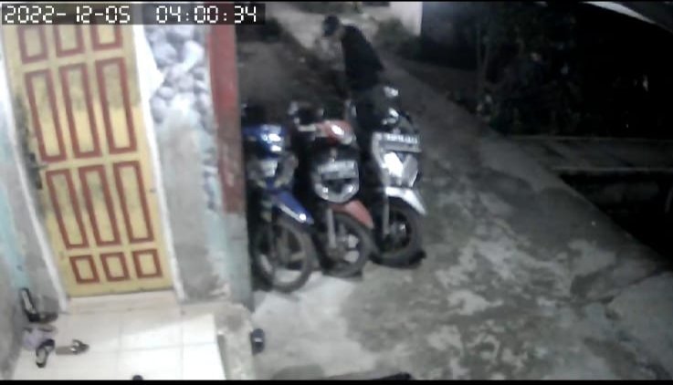 Berdasarkan informasi dihimpun, sesuai dari rekaman CCTV nampak pelaku seorang diri dengan menggunakan jaket dan topi warna hijau, celana pendek. Pelaku mendekati parkiran tempat tiga unit motor yang ada disamping rumah korban.