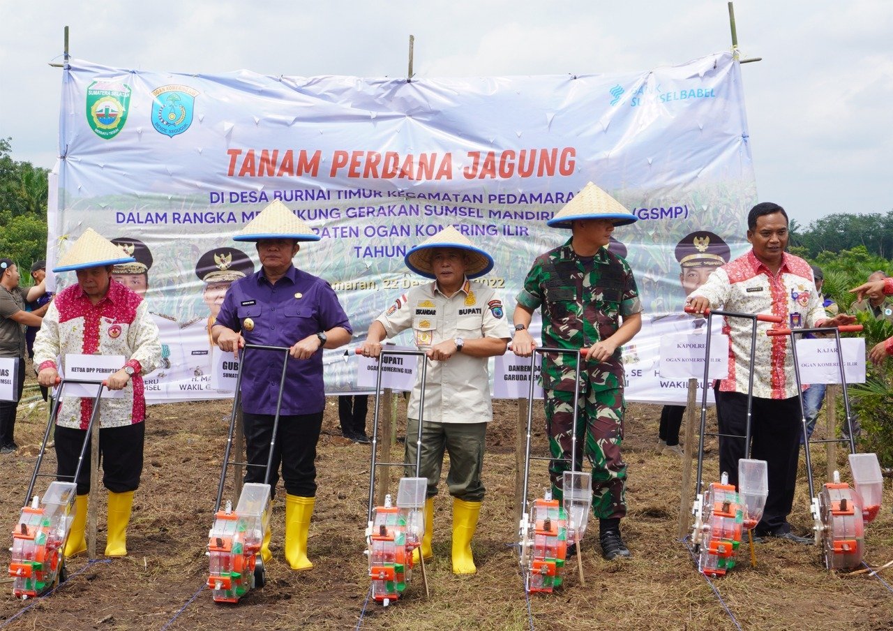 Krsumsel.com – Gubernur Sumatera Selatan, Herman Deru bersama Bupati OKI, H. Iskandar, SE dan Direktur Utama Bank Sumsel Babel melakukan penanaman jagung di Kawasan Pilot Project Corporate Farming Plus (Korporasi Petani) di Desa Burnai Timur Kecamatan Pedamaran OKI, Kamis, (22/12).