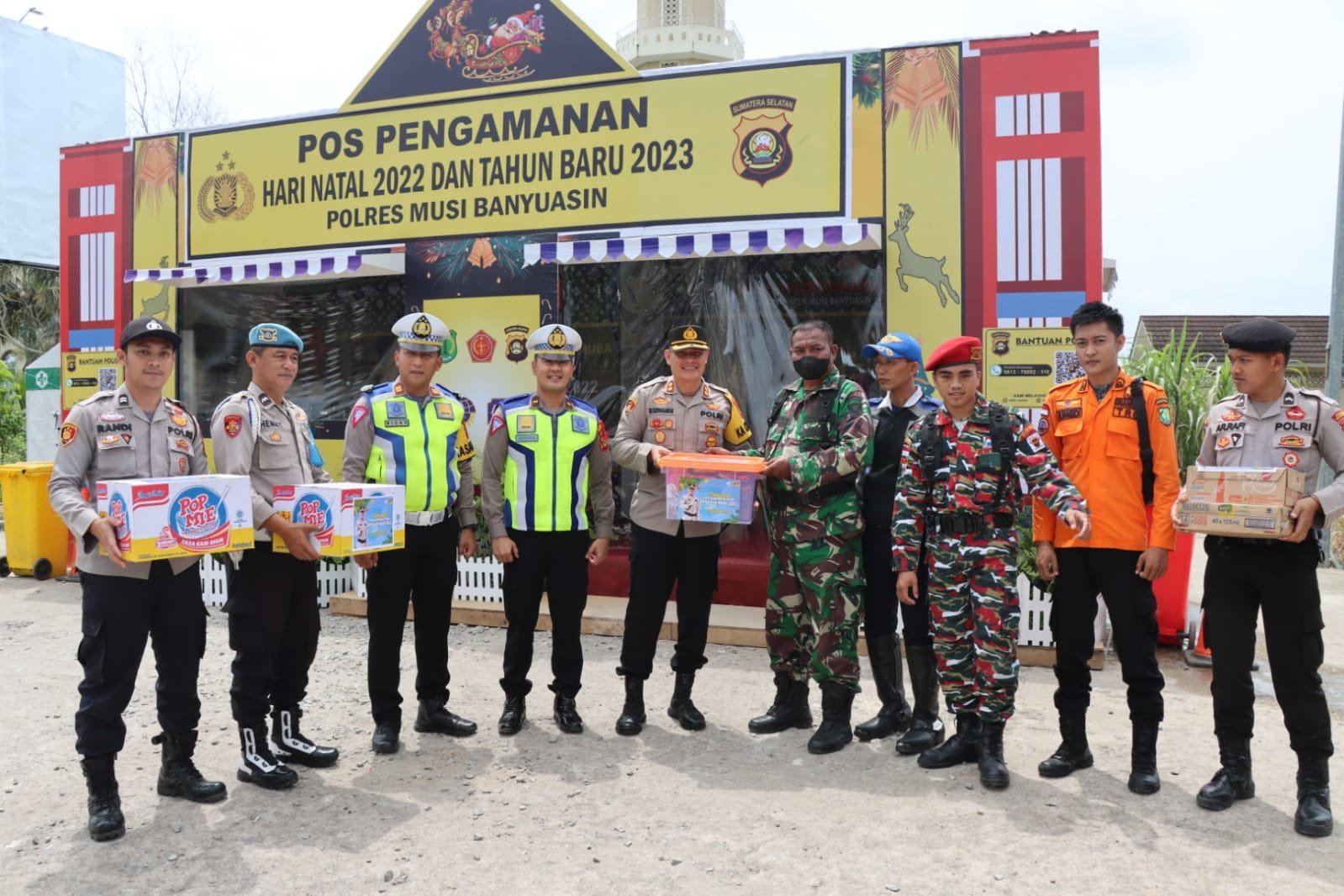 Tampak sebelum meninggalkan pos PAM Kapolres Muba AKBP Siswandi memberikan bingkisan untuk petugas pengamanan Nataru 2022.(AS/RIL)