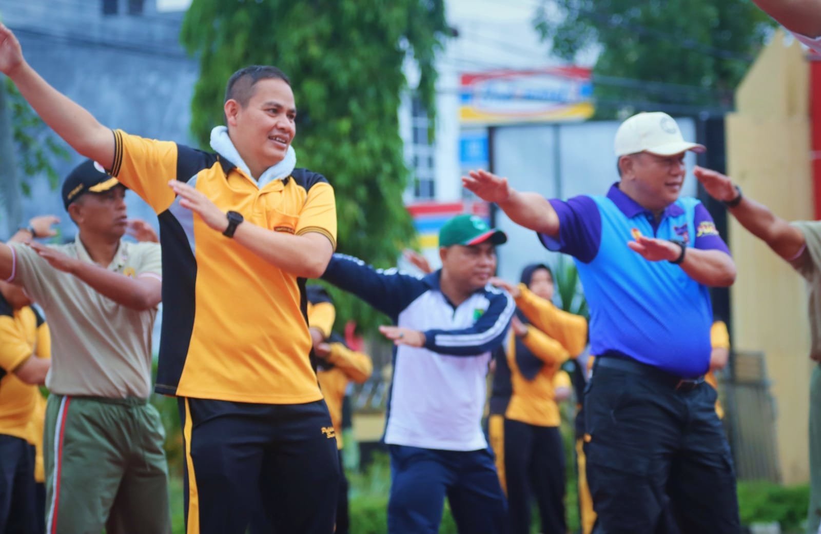 Krsumsel.com – Dalam rangka menjalin solidaritas, kebersamaan guna mewujudkan situasi wilayah Kabupaten Muba yang kondusif dan aman, pimpinan Forum Koordinasi Pimpinan Daerah (Forkopimda) Kabupaten Muba bersama Pj Sekretaris Daerah Muba melaksanakan senam bersama di Halaman Mapolres Muba, Jum’at (24/2/2023).