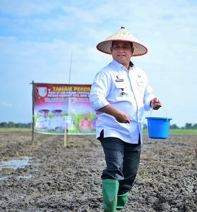 Krsumsel.com – Bupati Banyuasin H. Askolani, SH.,MH bersama Kepala Dinas Tanaman Pangan dan Holtikura Syarif, SP., M.SI melaksanakan penanaman perdana padi IP 200 milik kelompok tani di Desa Purwosari, Kecamatan Tanjung Lago untuk menuju Banyuasin Bangkit, Adil dan Sejahtera, Selasa (14/3/2023).