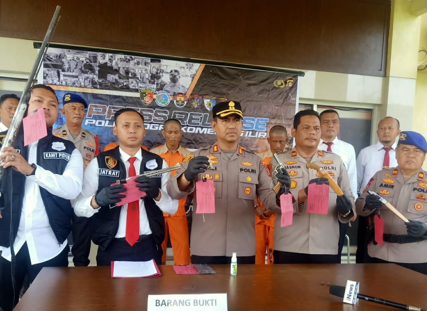 Saat penggerebekan, ditemukan 1 pucuk senpira laras pendek dan 4 butir amunisi dan 1 butir selongsong amunisi. Lanjut, juga 1 pucuk senpira laras panjang jenis locok dan tojok besi serta handpone milik pelaku.