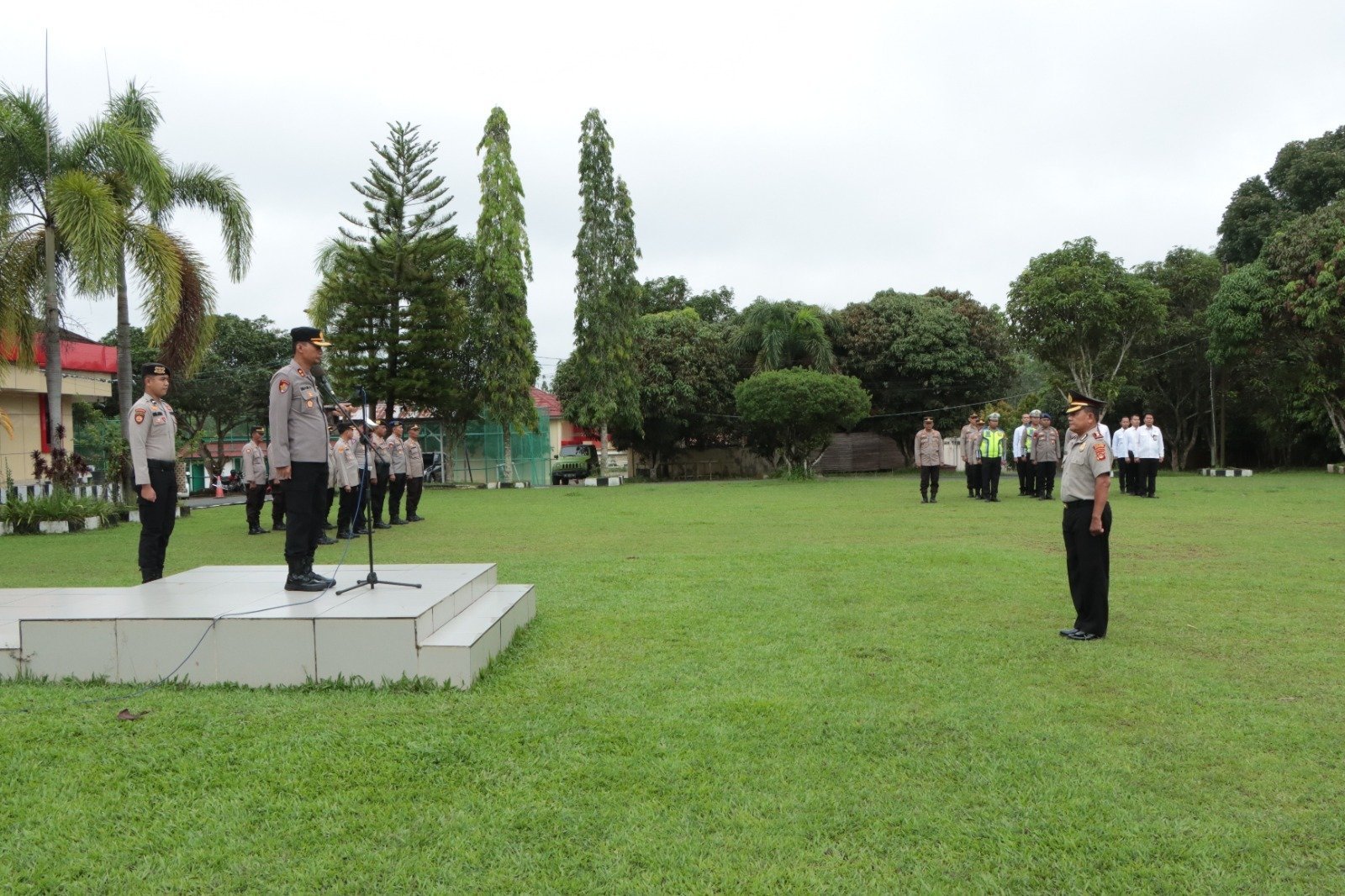 Upacara yang di hadiri oleh seluruh personil Polres Banyuasin termasuk Para Pejabat Utama (PJU) dan ASN serta personil yang mendapat kenaikan pangkat pengabdian AKP Subagio Jabatan Kapolsek Rambutan
