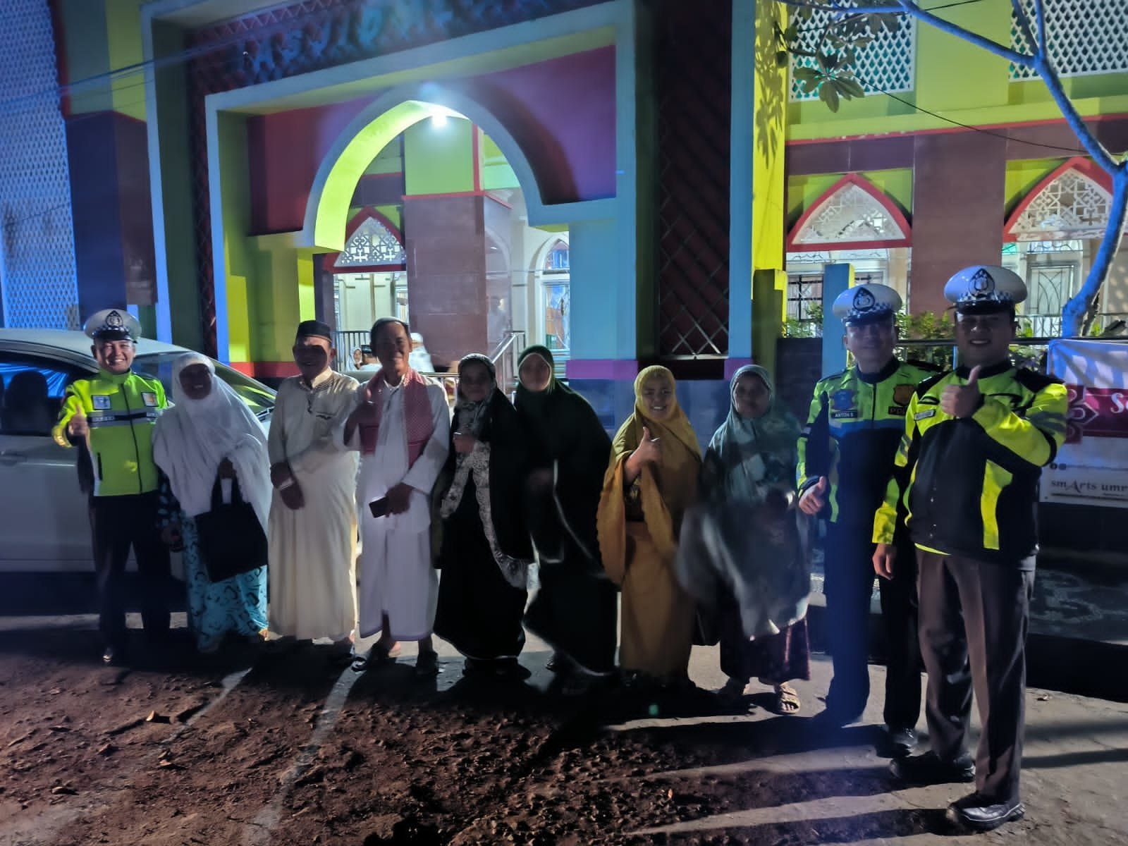 Terpantau, polisi lalu lintas ini juga turut melakukan pengaturan arus lalu lintas di masjid dan membantu menyeberangkan jamaah saat hendak melaksanakan shalat tarawih maupun setelah selesai shalat tarawih.