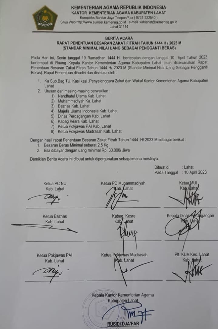 Dijelaskannya, dari hasil rapat penentuan besaran Zakat Fitrah tahun 1444 H 2023 M, dilanjutkan dengan kesepakatan sejumlah pihak diantaranya, Kakanmenag Lahat, Tu, para Kasi, PC NU Lahat, Muhammadyah Lahat, BAZNAS Lahat, MUI Lahat, Disperindag Lahat, Kabag Kesra Pemkab Lahat, Pokjawas PAI Lahat, dan Pokjawas Madrasah Lahat. “Untuk hasil dari rapat penentuan besaran Zakat Fitrah tahun 1444 H 2023 M tersebut, kita sepakati untuk Besaran Beras Minimal seberat 2,5 Kg. Sedangkan, Bila Dibayar Dengan Uang Minimal Rp.30.000/Jiwa,” pungkas Kakanmenag Kabupaten Lahat.