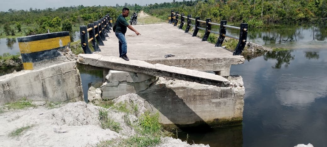 Jembatan berukuran kurang lebih 5 meter tersebut ambruk dibagian badan jembatan sehingga tidak ada akses manfaat untuk masyarakat khayak.