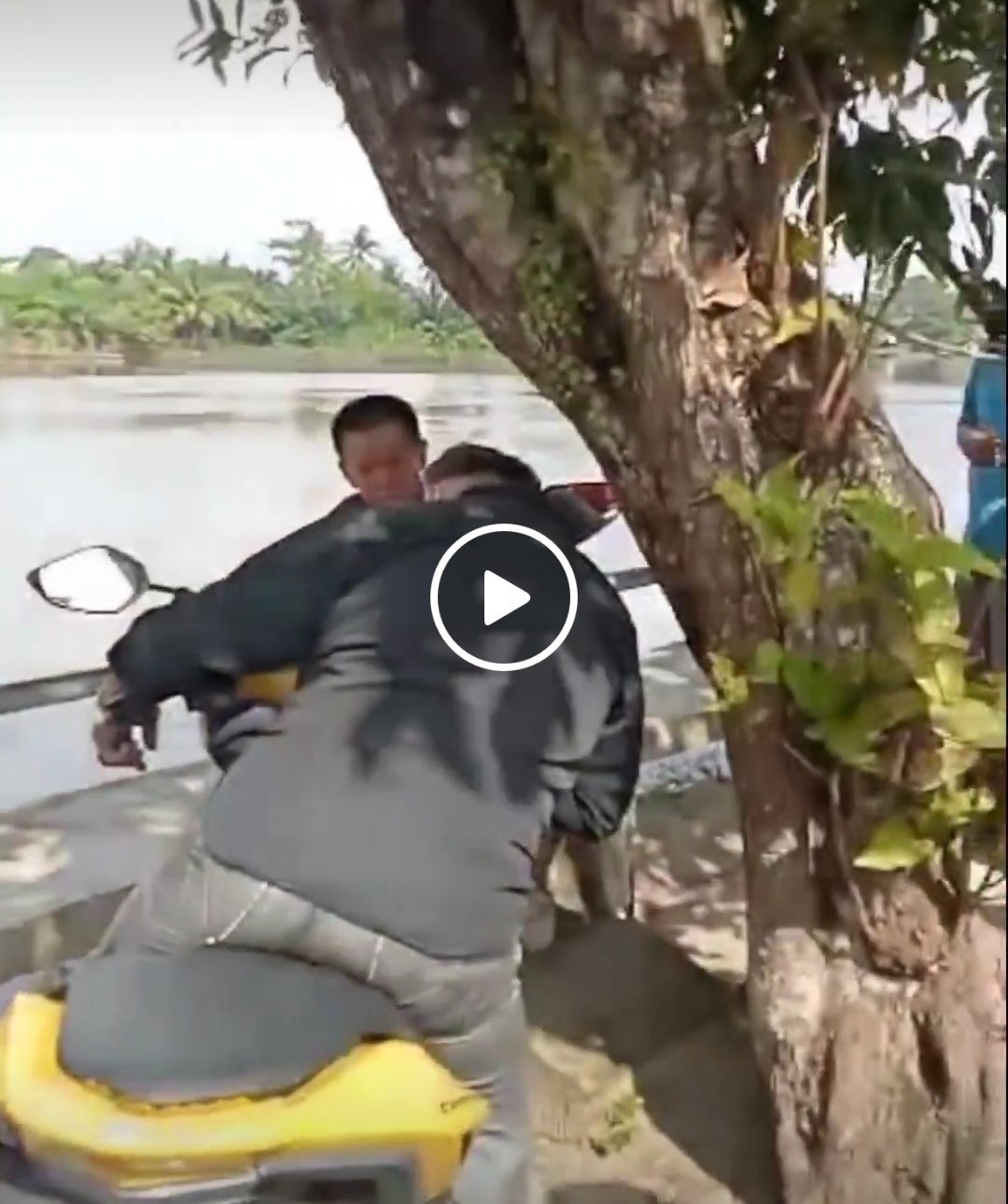 Posisi saat itu Sahri berada diatas motor dekat batang jambu tangannya terjuntai ke depan dan kaca spion motor tersangkut di batang jambu.