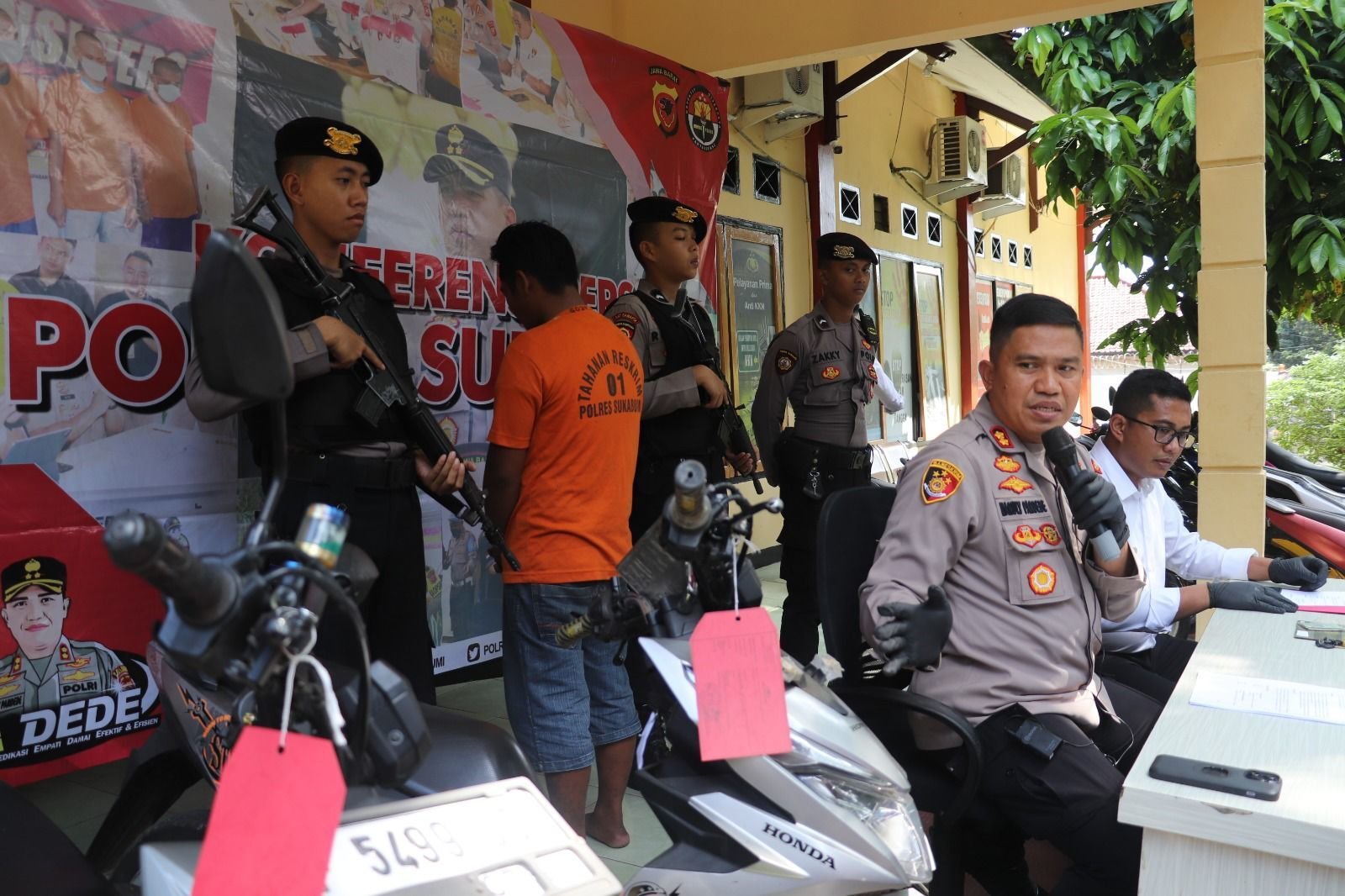 Konferensi Pers Ungkap Kasus Tindak Pidana Pencurian Dengan Pemberatan Kendaraan Sepeda Motor dipimpin langsung Oleh Kapolres Sukabumi AKBP Maruly Pardede, dan di dampingi oleh Kasat Reskrim Polres Sukabumi AKP Dian Pornomo.,.,dan Kasi Humas Polres Sukabumi Iptu Aah Saeful Rohman.