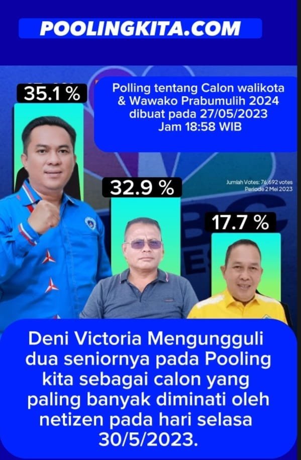 Diketahui polling tersebut dibuat pada Sabtu 27 Mei 2023 kemarin dan nama Deni Victoria berhasil memperoleh klik polling terbanyak dengan hasil sementara 1118 opsi klik atau 37,06 % hingga Selasa 30 Mei 2023.