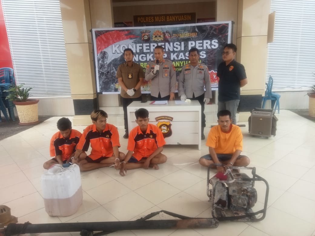 Warga Desa Teluk Kijing, Kecamatan Lais, Kabupaten Muba itu diamankan saat masih berada dilokasi penyulingan minyak yang terbakar. “Yang bersangkutan merupakan pemilik penyulingan minyak ilegal, kita amankan bersama sejumlah barang bukti,” ungkap Kapolres Muba AKBP Siswandi SIk didampingi Kasat Reskrim AKP Morris Widhi Harto SIk dan Kasi Humas AKP Susianto saat menggelar konferensi pers, Sabtu (24/6/2023) di Mapolres Muba.