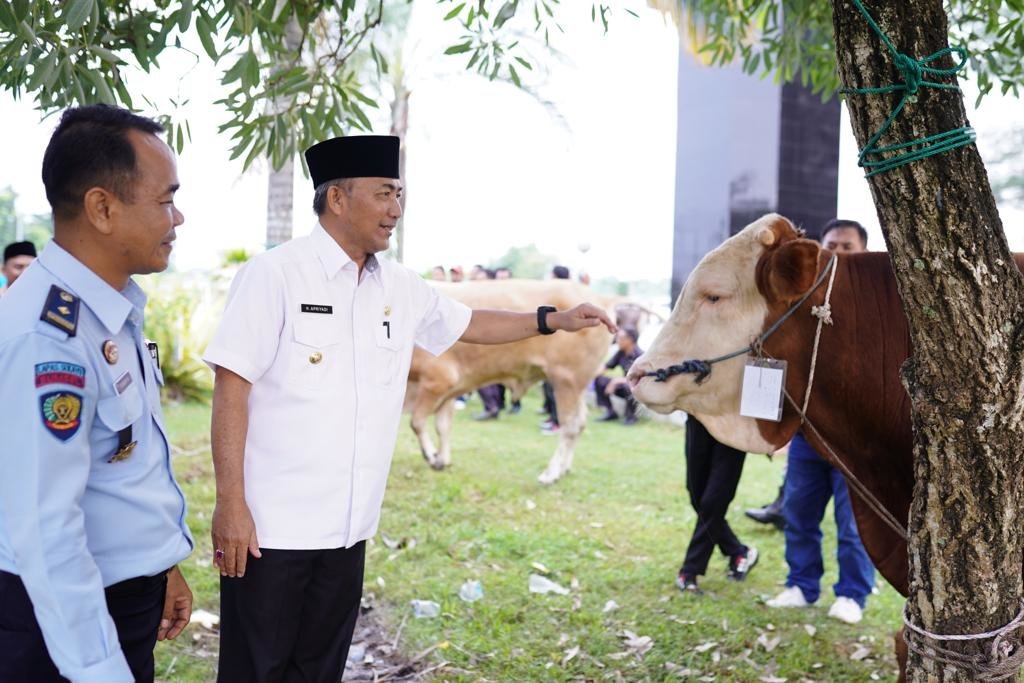 Krsumsel.com – Puluhan hewan kurban berupa Sapi dan Kambing hasil urunan pejabat di lingkungan Pemkab Muba disalurkan langsung Pj Bupati Apriyadi Mahmud, Selasa (27/6/2023) di Masjid Raya Baitul Makmur Sekayu.k