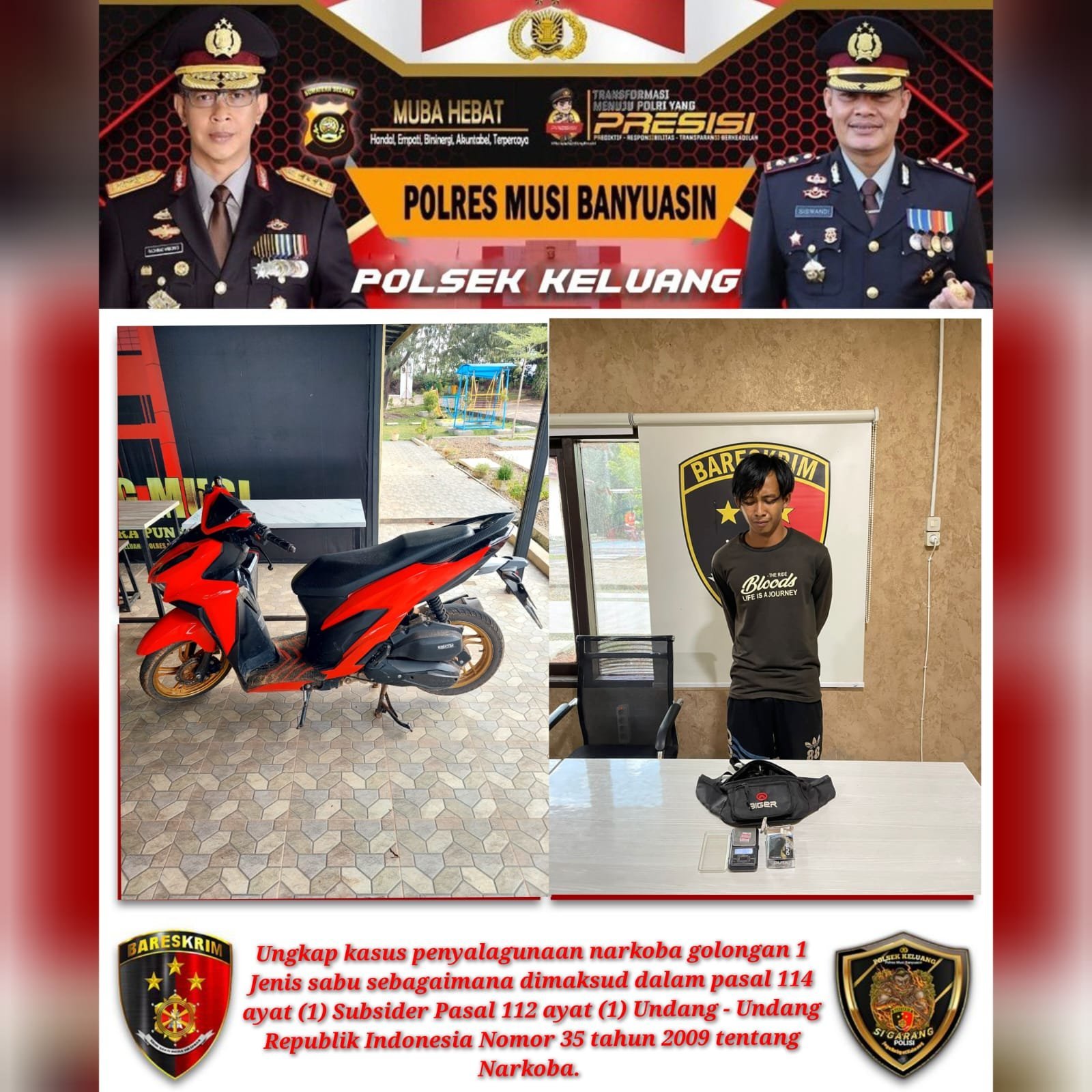 “Pras ditangkap saat melintas mengunakan sepeda motor di jalan umum Simpang Pauh, Kelurahan Keluang, Kecamatan Keluang, Kabupaten Muba pada, Minggu (09/07/2023) sekitar pukul 09:45 wib. Dari hasil penggeledahan ditemukan barang bukti 2 buah paket sabu-sabu seberat 0,25 gram yang disimpan di dalam kotak rokok pada tas selempang miliknya, ” kata Kurniawan.